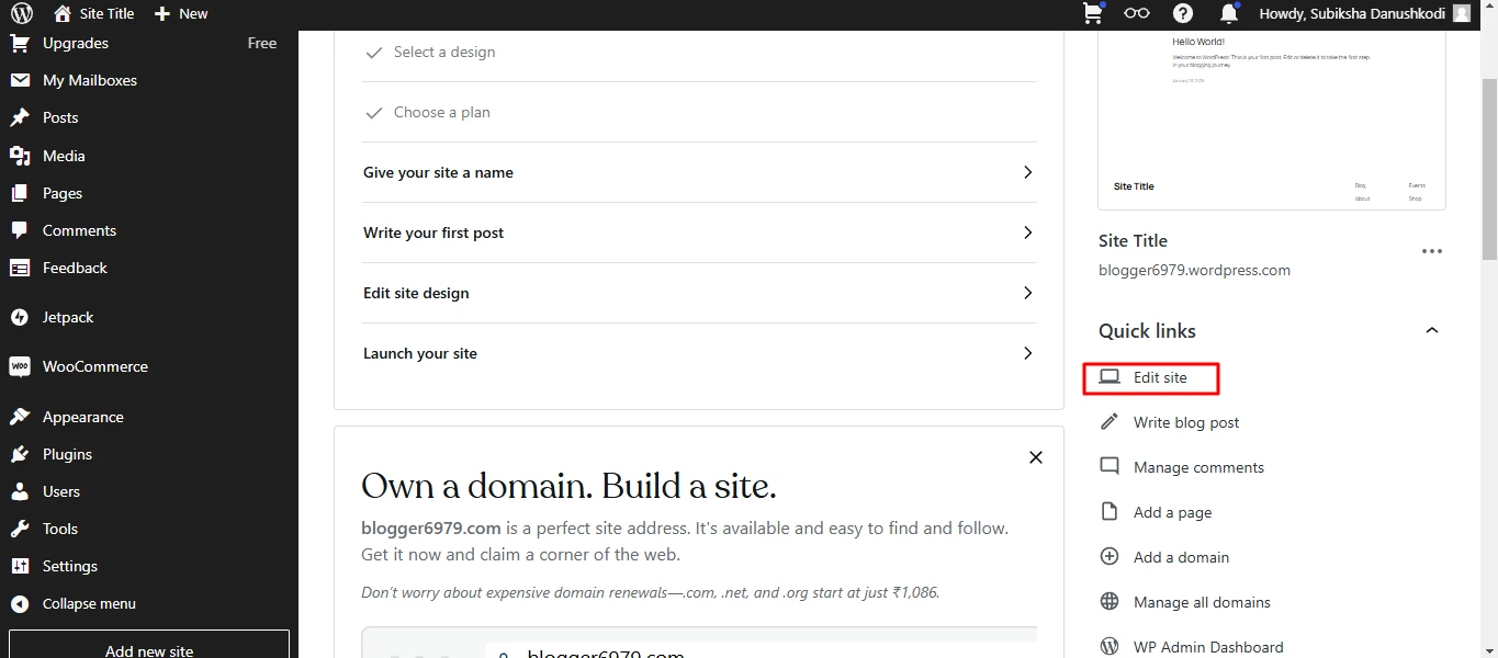 On coming to website creation, you need to complete the sign-in process. Once completed, go to your WordPress dashboard. On the right side of your screen, you can see the details of the domain you've purchased.