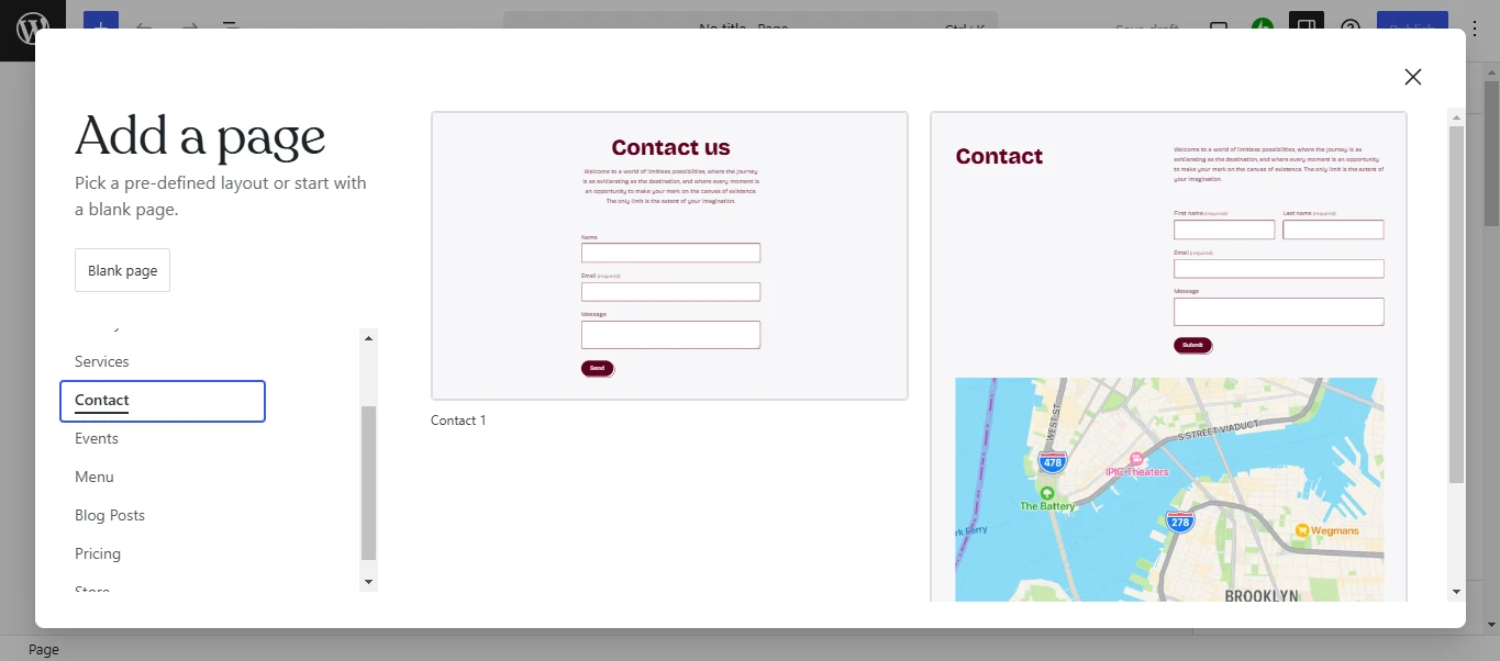 - Again, go to the WordPress dashboard and select Add A Page. I have selected the Contact Us page because, on the website I've created, users should contact the store directly to place an order.