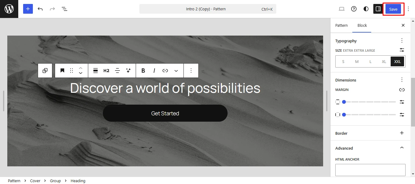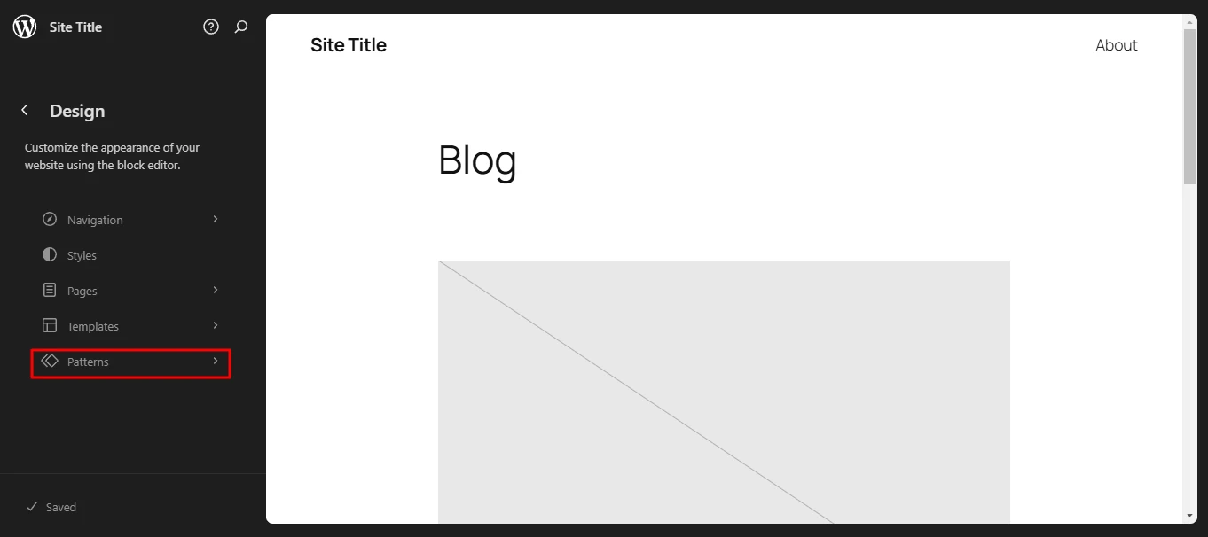 - On the WordPress dashboard, select Edit Site and click on Patterns