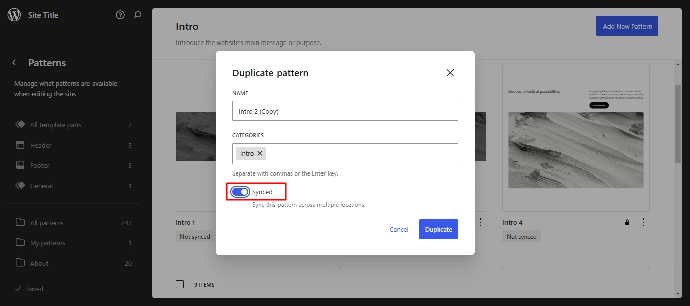 - Check whether the pattern is synced. If not, click on the three-dots option and duplicate the page.