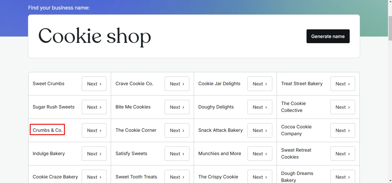 All you have to do is, enter your business. For example, let us enter "Cookie Shop". Among all the options, let's choose Crumbs & Co which we used to build a website earlier. Now, it is your choice to pickup a name for your business.