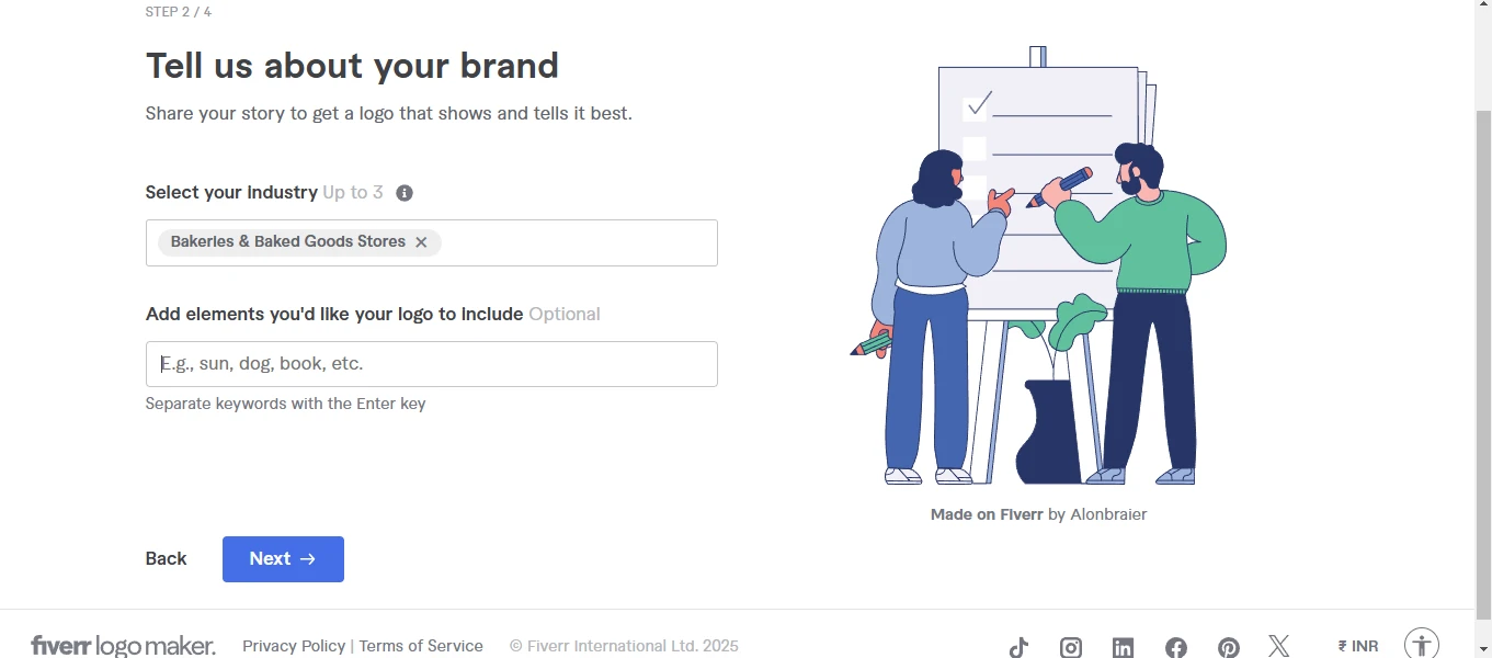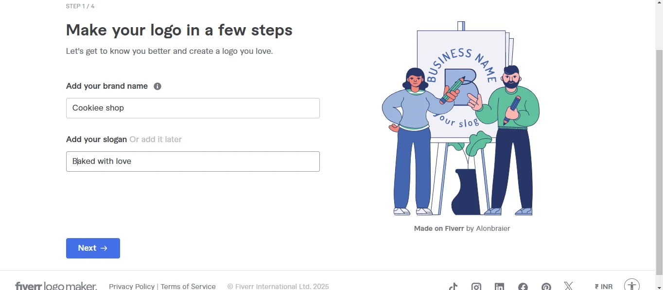 - On the home page, enter your business. For example, I have entered a cookie shop. If you have any slogan, enter it. If not, Fiverr will automatically add a slogan. Once done, hit Next.