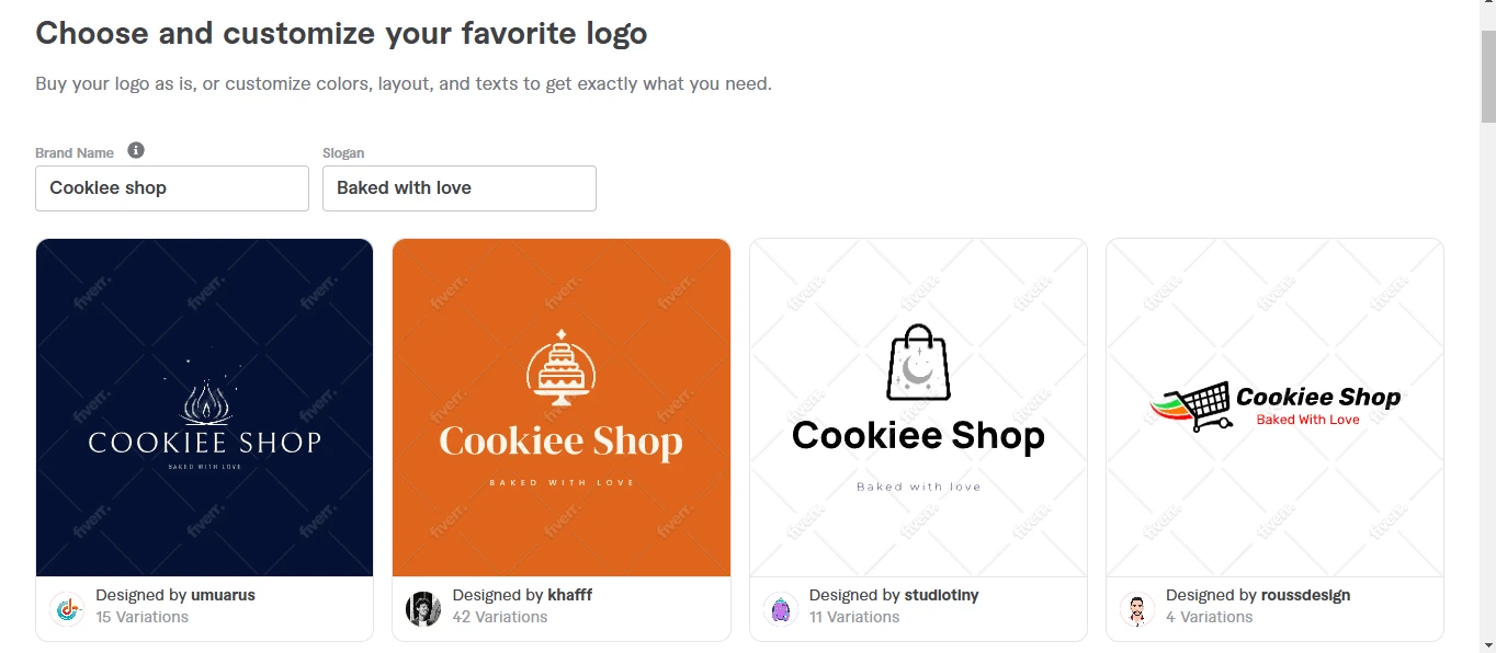 - After a minute, you will be displayed different variations. Choose what you prefer. If needed, you can customize the logo.