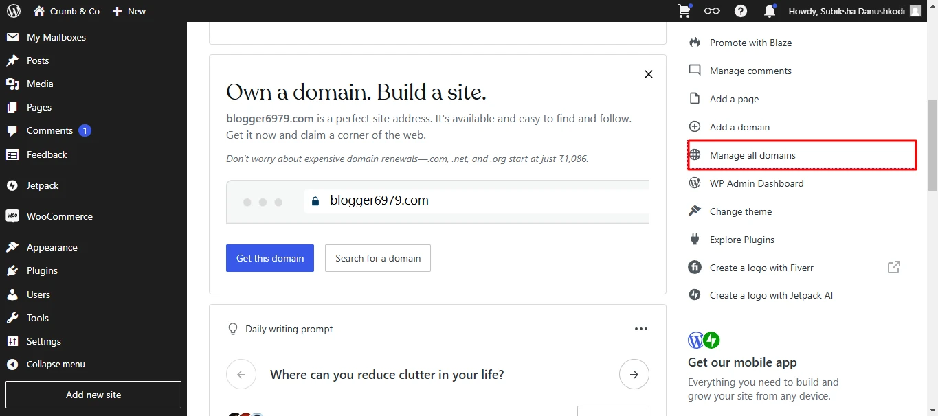 - Go to your WordPress Dashboard and select Manage All Domains.