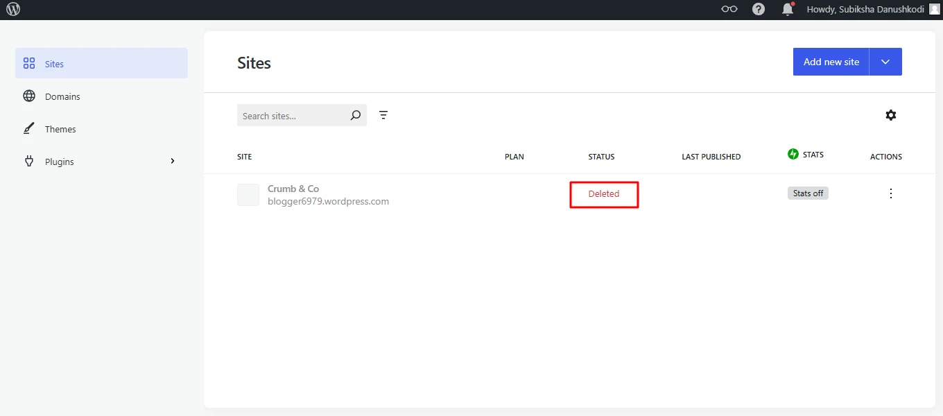 - To cross-check whether your site is deleted, Manage All Domains >>Site. Here, you can see the website status as Deleted.