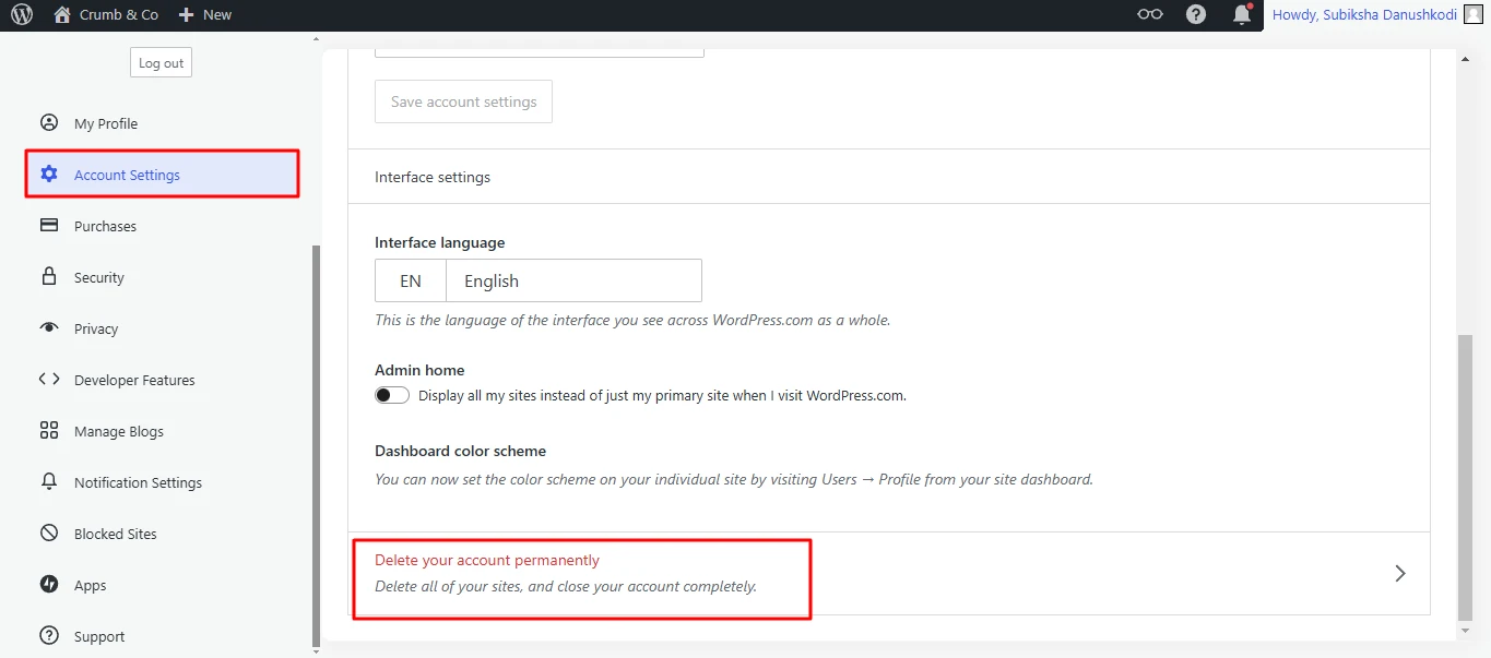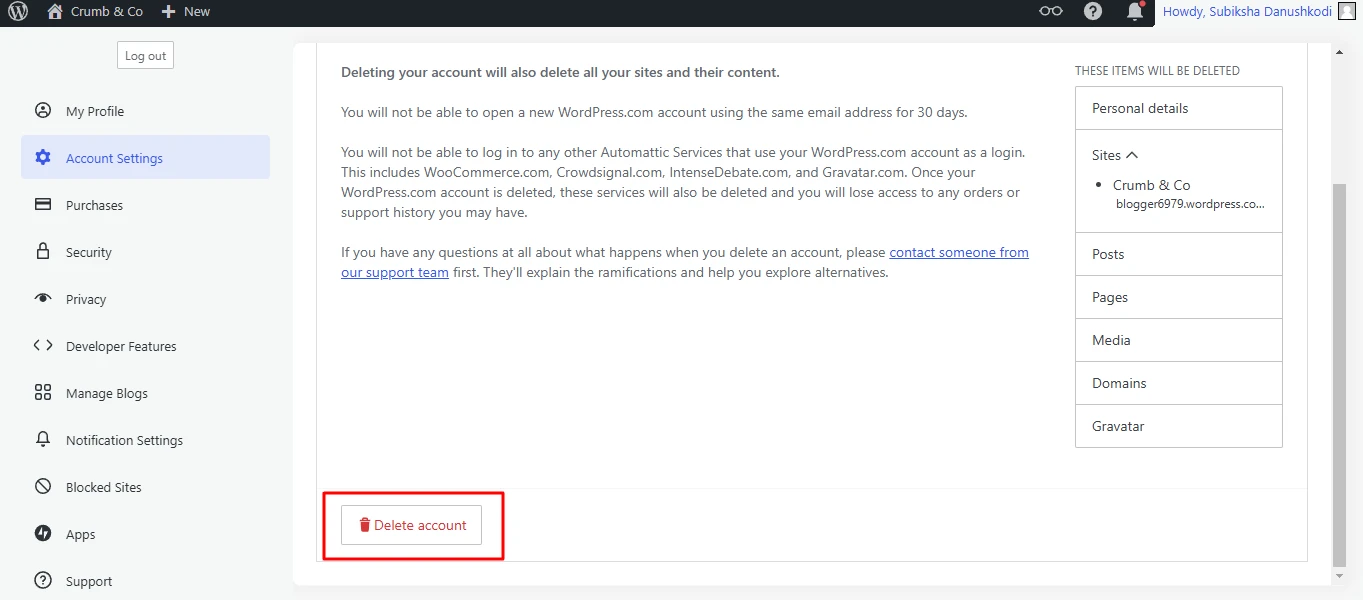 When you delete your WordPress.com account, all related data will be deleted, including which websites are created, which subscriptions are active, and what information is stored. Before proceeding, make sure you are not going to need access to any of this content again.