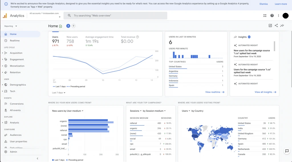 2. Go to Reports > Reports Snapshot and obtain a high-level overview of the most important insights into traffic, such as active users, traffic sources, and audience engagement trends.